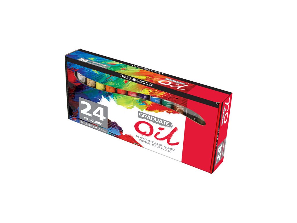 Olejové barvy Daler-Rowney Oil sada - 24x22ml. Tuby: 009, 024, 651, 618, 588, 540, 450, 123, 120, 375, 223, 035, 034, 221, 663, 382, 112, 409, 563, 503, 675, 635, 573, 001